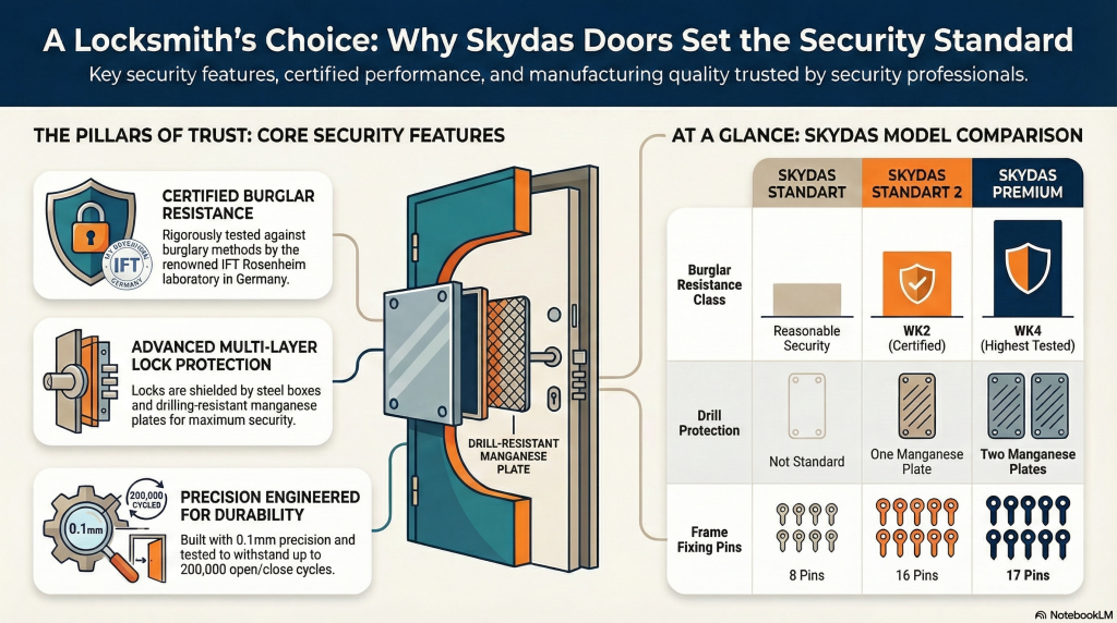 As experts dedicated to ensuring comprehensive residential and commercial safety, professional locksmiths prioritize reliability, tested security standards, and manufacturing precision when recommending entry systems. Skydas doors are frequently the preferred recommendation because they meet the highest security requirements while delivering exceptional durability and thermal performance, offering clients “perfection and peace of mind”. Impregnable Security is the official SKYDAS Security Doors distributor for the Home Counties.